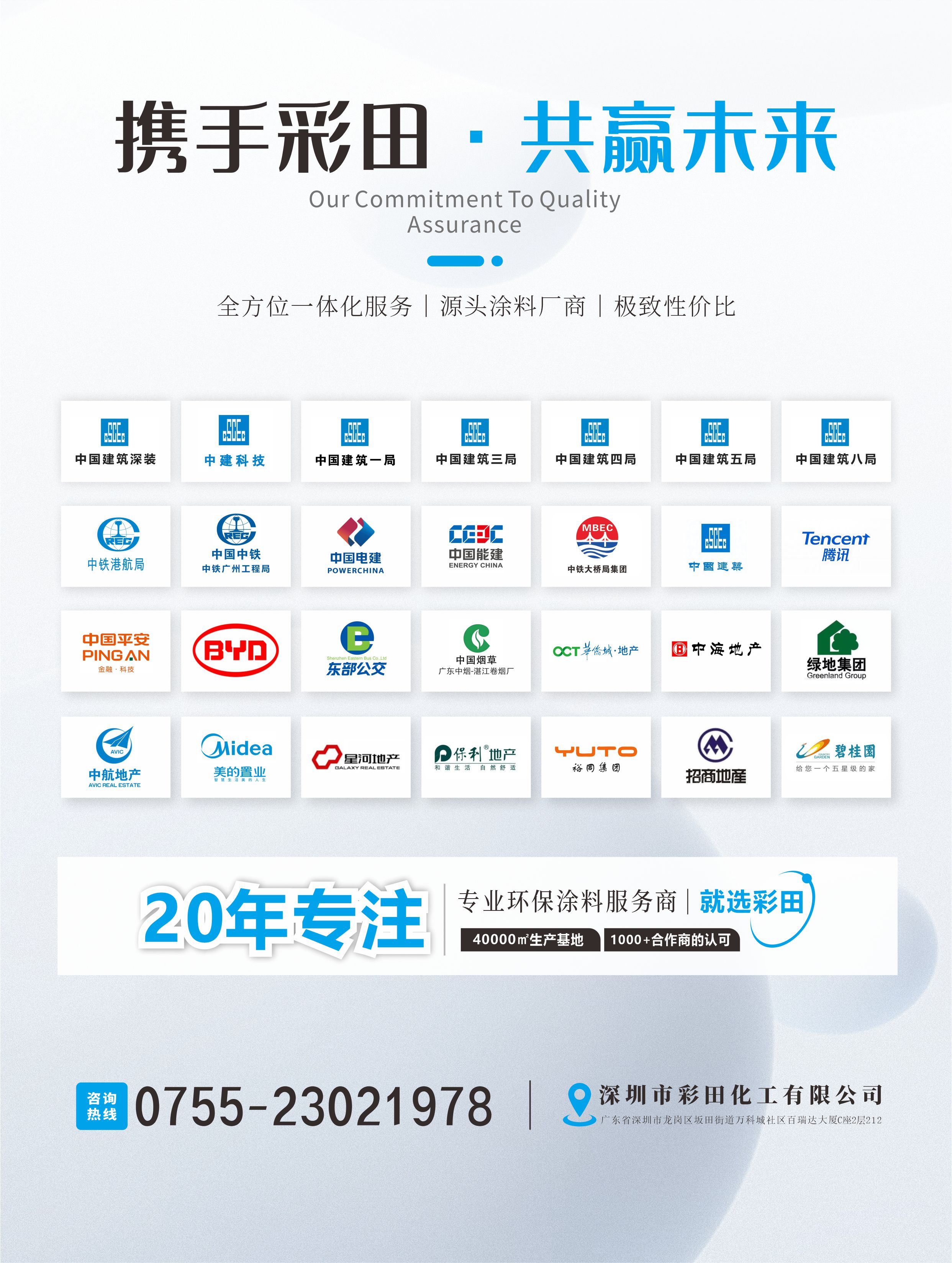 彩田產(chǎn)品應(yīng)用場(chǎng)景覆蓋市政工業(yè)防護(hù)材料;水系統(tǒng)防護(hù)材料: 自來(lái)水廠、污水處理廠、垃圾填埋場(chǎng);地坪環(huán)保材料:高端商業(yè)地坪,工業(yè)地坪,停車場(chǎng)地坪,透水地坪;海上平臺(tái)防護(hù)材料:隔熱保溫、保冷涂料; 高性能環(huán)保涂料:水性納米環(huán)保涂料、聚脲、聚氨酯砂漿、無(wú)溶劑環(huán)氧、隔音涂料;工業(yè)防護(hù)材料:電池內(nèi)壁絕緣防護(hù)涂料等一系列防護(hù)涂裝材料體系。彩田同時(shí)也是綠色化城市建設(shè)的倡導(dǎo)者,自主研發(fā)出多款綠色環(huán)保水性材料,產(chǎn)品通過(guò)“十環(huán)認(rèn)證”。彩田追求環(huán)保綠色創(chuàng)新的理念,已獲得1000+合作商的信賴與認(rèn)可。