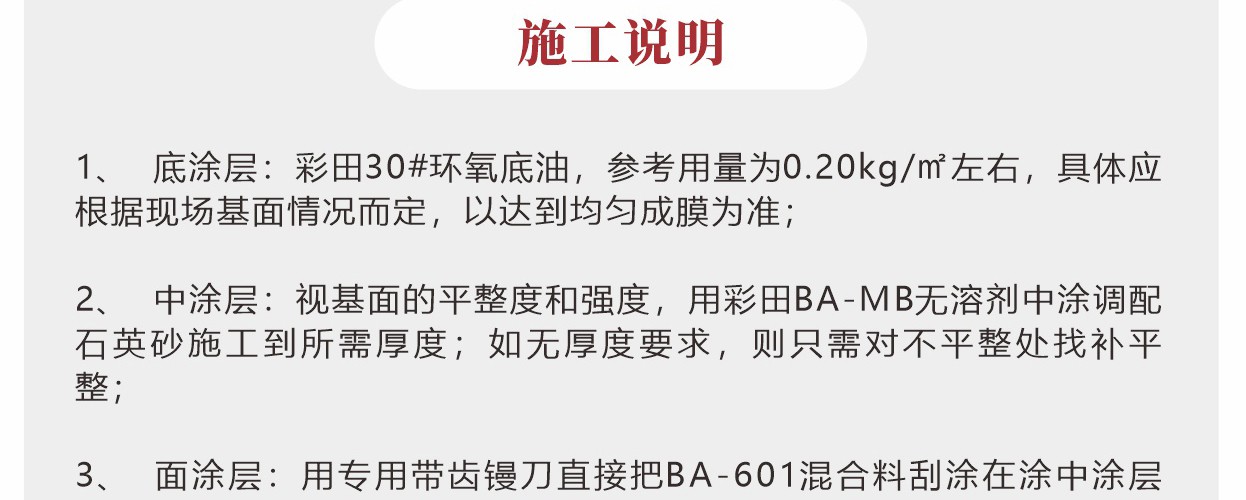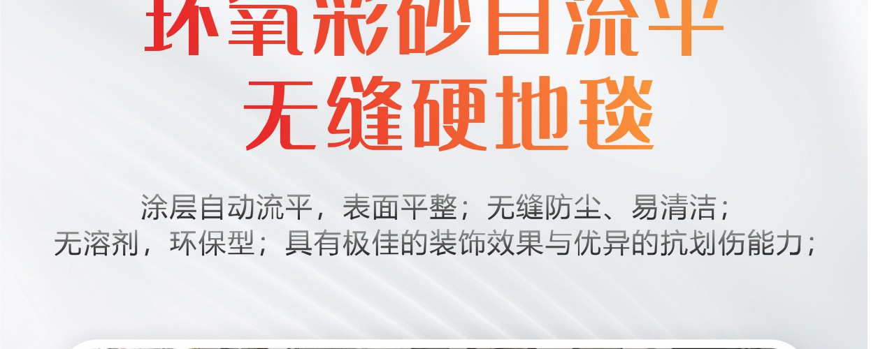 來(lái)自彩田化工 —環(huán)氧彩砂自流平涂裝材料系列 1、涂層自動(dòng)流平,表面平整; 2、無(wú)接縫、不起塵、表面易于清潔; 3、無(wú)溶劑,環(huán)保型; 4、具有極佳的裝飾效果與優(yōu)異的抗劃傷能力; 5、密實(shí)的表面可以抵抗多種化學(xué)品的侵蝕。
